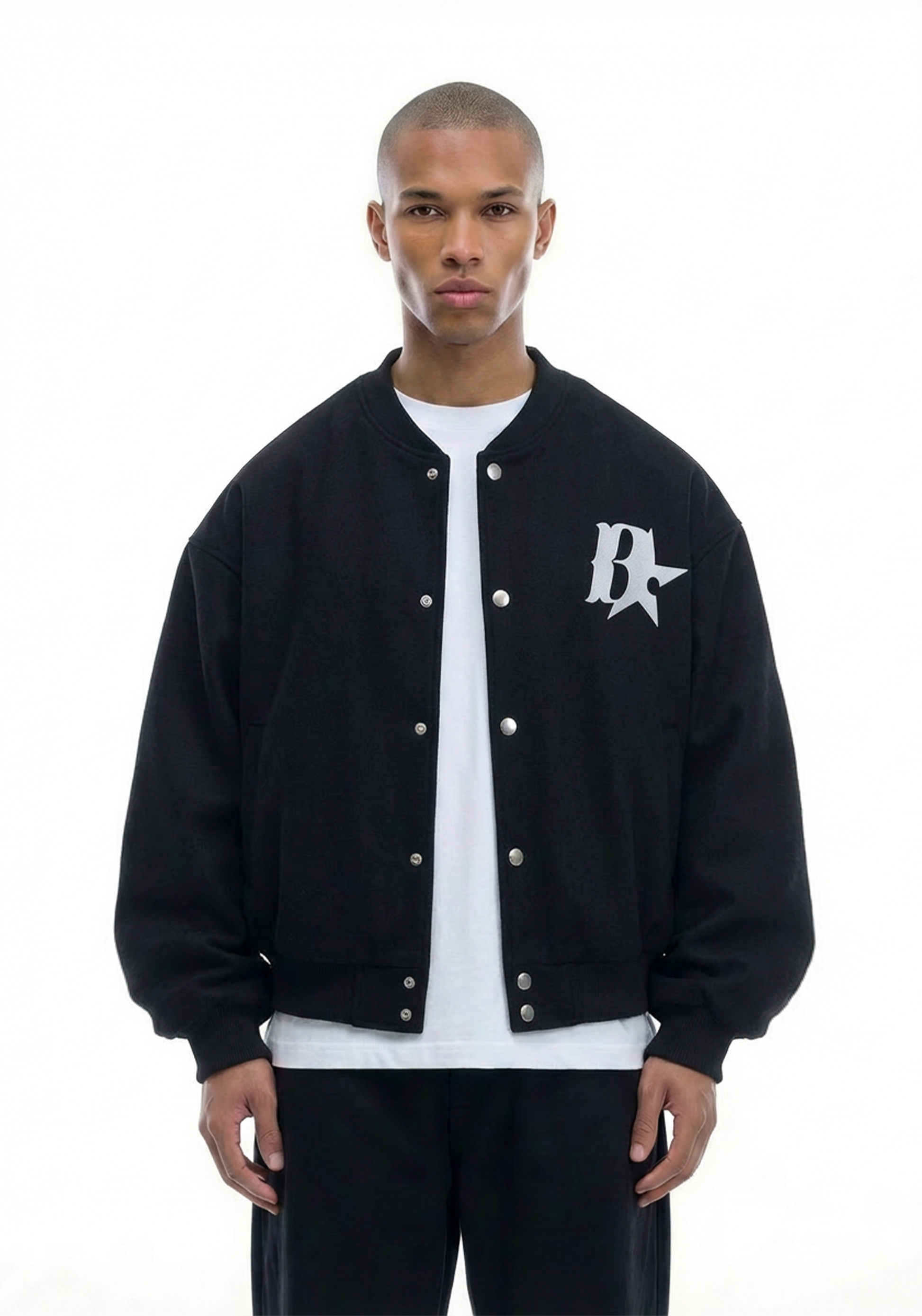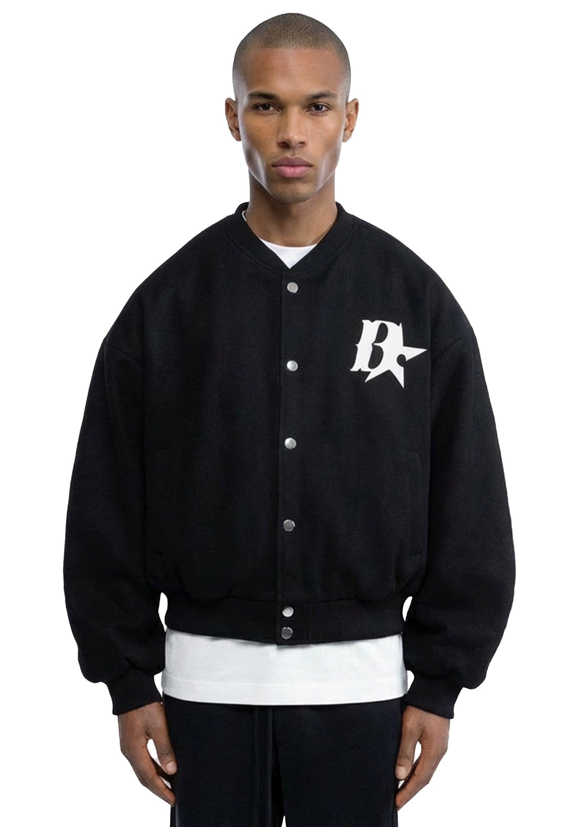 Make a bold statement with this oversized bomber jacket, designed for both style and comfort. Crafted from premium wool, this jacket provides a luxurious feel and exceptional warmth, perfect for cooler seasons. The design features a traditional puff print logo on the left chest, adding a subtle yet striking detail to the clean, modern silhouette.